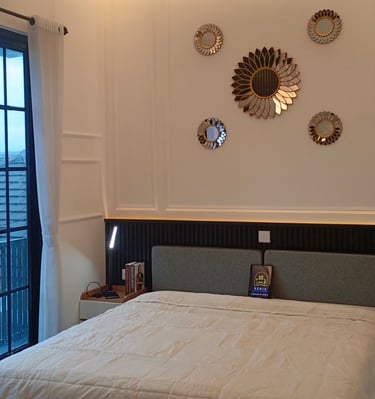 Set kamar tidur yang didesain agar satu tema dan memiliki ukuran yang pas dengan kamar di rumah anda. kamar set biasanya terdiri dari lemari pakaian, dipan, panel dinding dan bahkan backdrop dan meja TV.